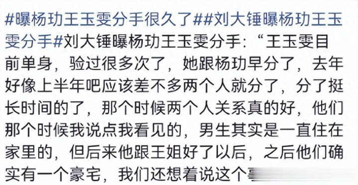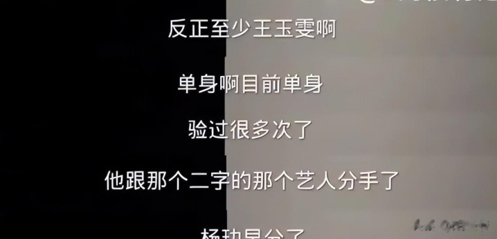 他在直播中明确爆料:“王玉雯目前单身,验过很多次了,她跟杨玏早分了,去年上半年差不多就分了。”